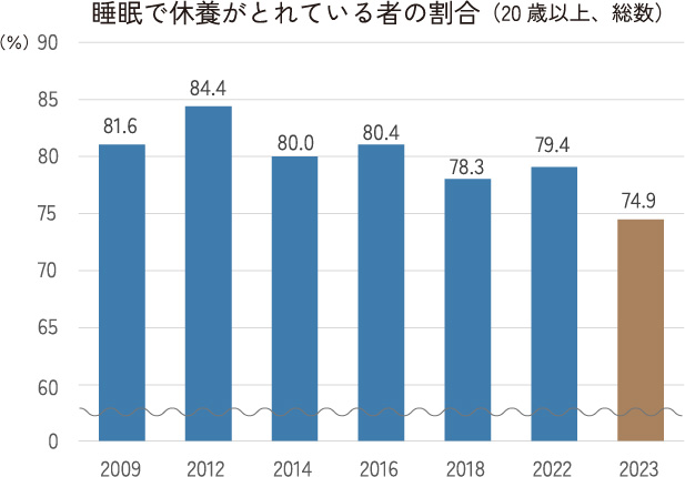 20歳以上の人に、ここ1カ月間に睡眠で休養がとれているかを聞いた調査では「充分とれている」「まあまあとれている」と回答した人の割合は74.9%。4人に1人は「休養がとれていない」と感じていることがわかりました。
