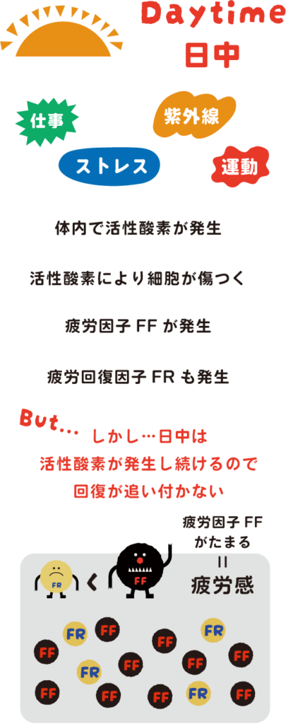 私たちの体には、疲労が生じるとそれを回復させるしくみが備わっています。疲労が発生しても、疲労回復が常に追い付いていれば、疲労がたまることはないでしょう。しかし、活動している日中には疲労がどんどん発生するため、疲労回復が間に合いません。